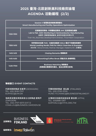 The forum will bring together industry experts from the Nordics and Taiwan to share the latest technological achievements and successful case studies. A business matching session will follow, offering companies opportunities to explore collaboration. This event will serve as an effective platform connecting Nordic innovation with Taiwan’s strengths in high-tech manufacturing.